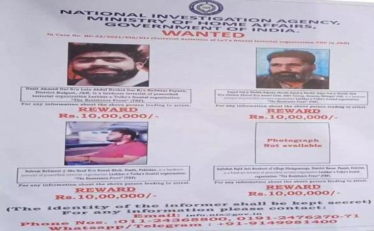 ਅਧਿਕਾਰੀਆਂ ਨੇ ਕਿਹਾ ਕਿ ਪੋਸਟਰਾਂ ‘ਚ ਸਿੰਧ ਦੇ ਨਵਾਬ ਸ਼ਾਹ ਦੇ ਪਾਕਿਸਤਾਨੀ ਨਾਗਰਿਕਾਂ ਸਲੀਮ ਰਹਿਮਾਨੀ ਉਰਫ਼ ‘ਅਬੂ ਸਾਦ’ ਅਤੇ ਕਸੂਰ ਦੇ ਸ਼ਾਂਗਮੰਗਾ ਦੇ ਸੈਫੁੱਲਾ ਸਾਜਿਦ ਜਾਟ ਅਤੇ ਉਨ੍ਹਾਂ ਦੇ ਸਥਾਨਕ ਸਹਿਯੋਗੀਆਂ ਸ਼੍ਰੀਨਗਰ ਦੇ ਸੱਜਾਦ ਗੁਲ ਅਤੇ ਦੱਖਣੀ ਕਸ਼ਮੀਰ ਦੇ ਕੁਲਗਾਮ ਦੇ ਰੇਦਵਾਨੀ ਪਾਈਨ ਦੇ ਬਾਸਿਤ ਅਹਿਮਦ ਡਾਰ ਬਾਰੇ ਜਾਣਕਾਰੀ ਮੰਗੀ ਗਈ ਹੈ। ਐੱਨ.ਆਈ.ਏ. ਨੇ ਜਨਤਾ ਨੂੰ ਸੂਚਨਾ ਸਾਂਝੀ ਕਰਨ ਲਈ ਆਪਣਾ ਈ-ਮੇਲ ਪਤਾ, ਫੋਨ ਨੰਬਰ, ਵਟਸਐੱਪ ਅਤੇ ਟੈਲੀਗ੍ਰਾਮ ਨੰਬਰ ਵੀ ਦਿੱਤੇ ਹਨ। ਇਸ ਨੇ ਲੋਕਾਂ ਨੂੰ ਭਰੋਸਾ ਦਿੱਤਾ ਹੈ ਕਿ ਮੁਖਬਿਰ ਦੀ ਪਛਾਣ ਗੁਪਤ ਰੱਖੀ ਜਾਵੇਗੀ।