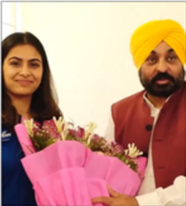 ਚੰਡੀਗੜ੍ਹ: ਪੈਰਿਸ ਓਲੰਪਿਕ ‘ਚ ਇਤਿਹਾਸਕ ਪ੍ਰਦਰਸ਼ਨ ਤੋਂ ਬਾਅਦ ਭਾਰਤ ਦੀ ਦੋਹਰਾ ਤਗਮਾ ਜੇਤੂ ਨਿਸ਼ਾਨੇਬਾਜ਼ ਮਨੂੰ ਭਾਕਰ ਅੱਜ ਮੁੱਖ ਮੰਤਰੀ ਭਗਵੰਤ ਮਾਨ ਨੂੰ ਮਿਲਣ ਲਈ ਉਨ੍ਹਾਂ ਦੇ ਘਰ ਪਹੁੰਚੀ।